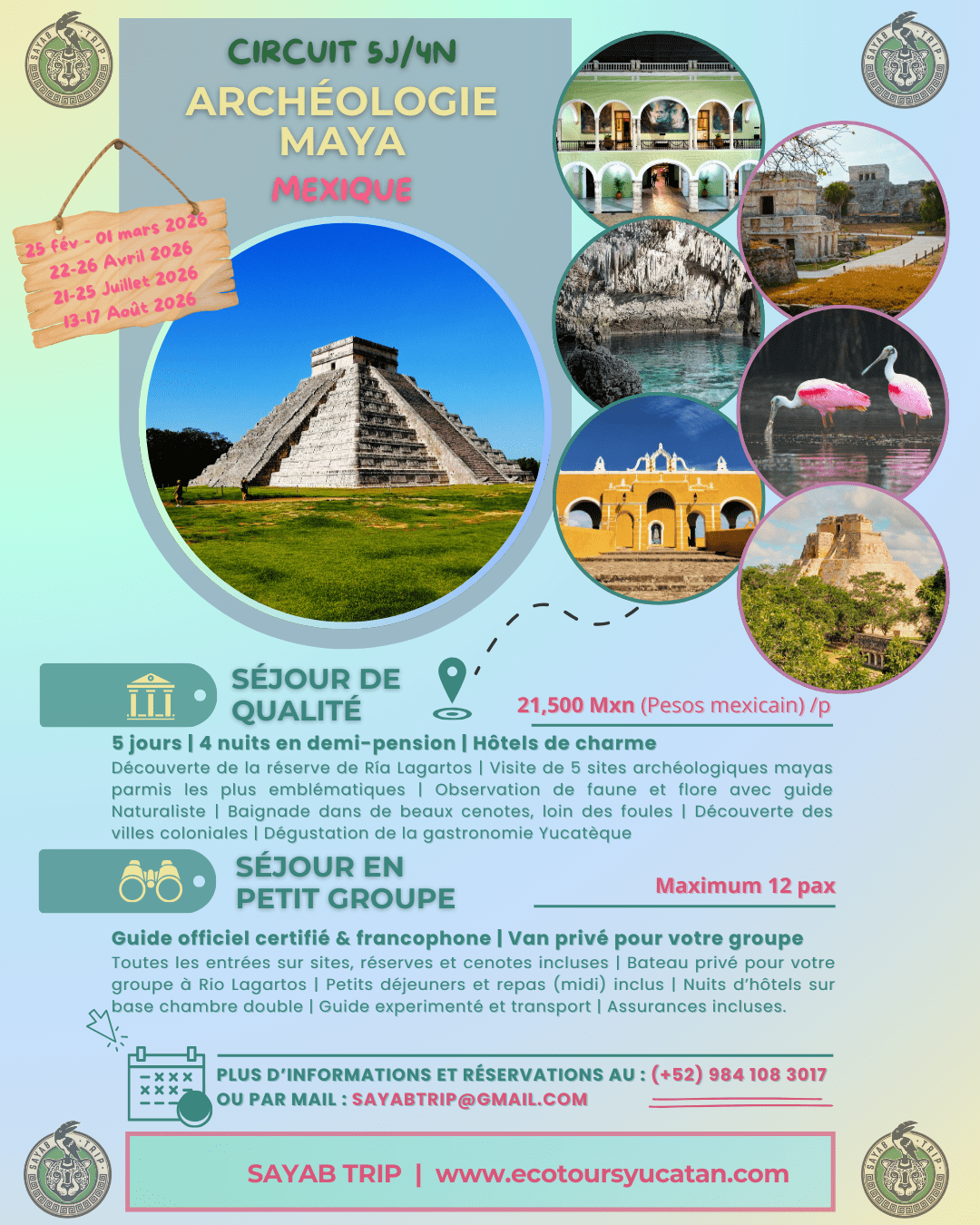 5 jours pour découvrir une réserve ornithologique superbe avec sa mangrove préservée, 5 sites archéologiques magnifiques de différentes époques et différents styles architecturaux, 3 villes coloniales colorées, des cenotes aussi beaux que différents, des villages mayas et l’accueil chaleureux de ses familles. Et bien sûr, le tout en dégustant une partie de la gastronomie typique du Yucatan.