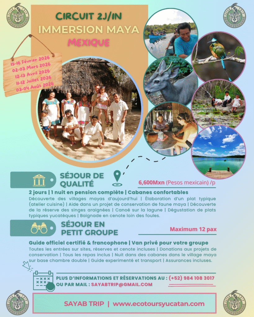 Nous partirons de la Riviera Maya vers un village typique du Quintana Roo où nous commencerons par notre atelier gastronomique. Une première famille nous fera découvrir son « huerto », champ de culture maraîchère. Nous irons y cueillir des fruits et des légumes pour cuisiner, ensemble, un repas traditionnel que nous aurons le plaisir de déguster. Nous pourrons ensuite aller nous rafraîchir dans l’eau claire d’un cenote. En fin d’après-midi, nous irons prendre possession des cabanes rustiques et confortables où nous passerons la nuit.